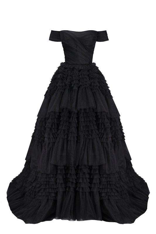 WyprzedaneBlack Off-The-Shoulder Frill-Layered Gown